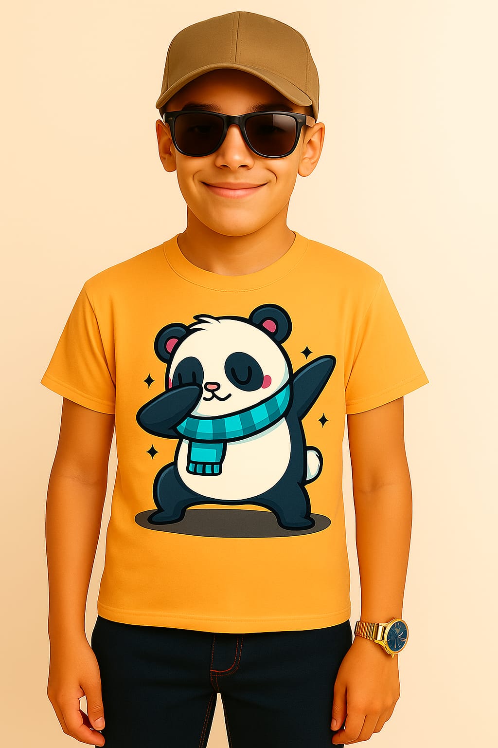 Add a playful punch to your child’s wardrobe with this vibrant mustard yellow kids’ T-shirt featuring an adorable dabbing panda graphic. Designed for fun and comfort, the cartoon panda is styled with a cheerful expression, teal-blue scarf, and dynamic pose, making it a hit among kids who love expressive fashion.